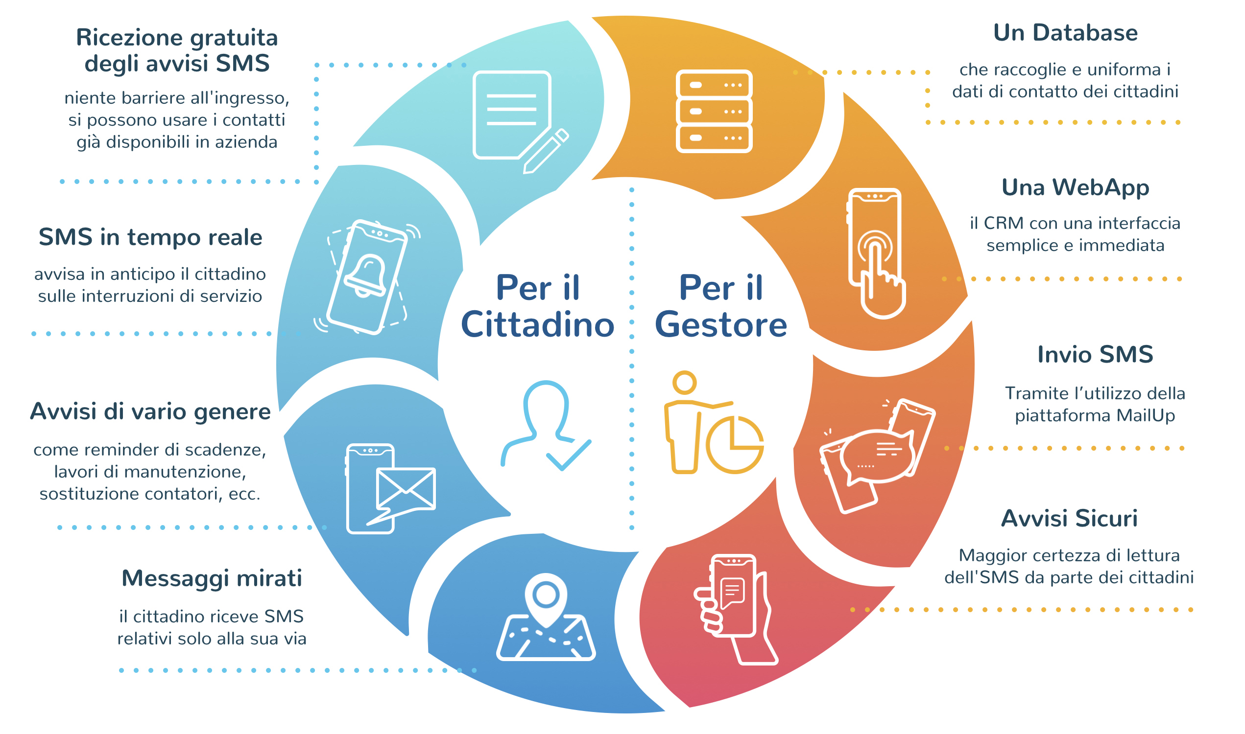La possibilità per gli operatori di utilizzare un sistema di gestione semplice e rapido per comunicazioni in merito a diverse tematiche (interruzioni idriche, fatture, recupero crediti, ecc.); per l'azienda maggior probabilità che l'invio vada buon fine, vista la percentuale notevole di aperture degli SMS rispetto ad altri sistemi di comunicazione (92%).